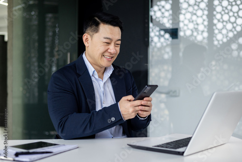 A young Asian businessman sits in the office at the table, holds the phone in his hands, types a message, reads the news, smiles