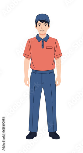 A young Asian man in a work uniform with a cap, standing full body. Vector character illustration for service or delivery staff concepts.
