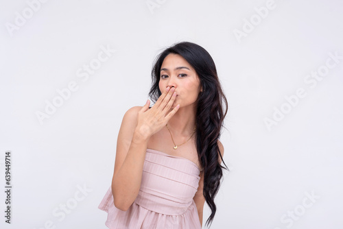 A young asian woman blows a kiss to the camera. Being flirty and playfully romantic. Isolated on a white background.