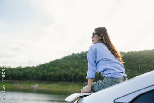 A young Asian woman leans on a white car, gazing thoughtfully at a serene mountain lake, embracing peace, nature, freedom, and the spirit of exploration.