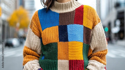 A young Asian woman wearing a vibrant, multicolored knitted sweater poses confidently on a city street, showcasing a stylish urban look.