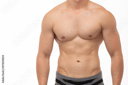 A young athletic guy with an athletic build and a smooth body poses against a white isolated background after shaving. athlete's torso in underwear. Concept: diet, men's health, fitness