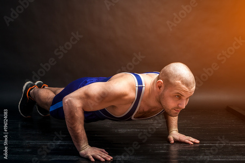A young athletic man in blue wrestling tricky and blue shorts does push-ups on a black-haired isolated background in a photo studio