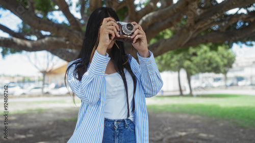 A young attractive hispanic woman taking a photo with a camera in an outdoor park setting on a sunny day, wearing casual clothes with a large tree in the background.