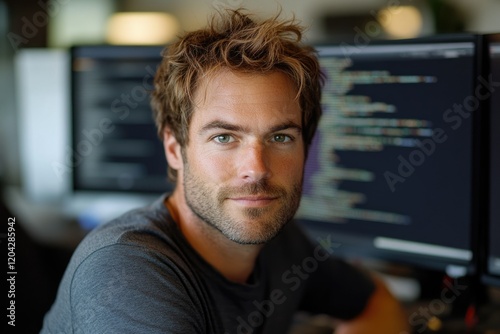 A young, attractive man with light brown hair sits in front of computer screens displaying code.