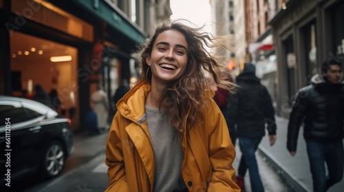 A young attractive woman demonstrates fashionable clothes on a city street. Dynamic pose. Fashion, female beauty.