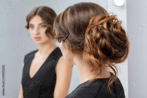 A young attractive woman with beautiful makeup in a black dress straightens her hair in front of a mirror.