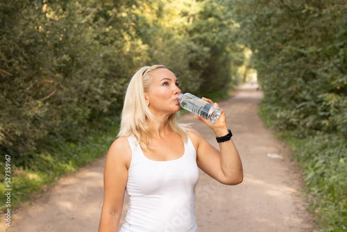 a young beautiful girl drinks water from a bottle while jogging through the forest on a hot summer day Healthy lifestyle
