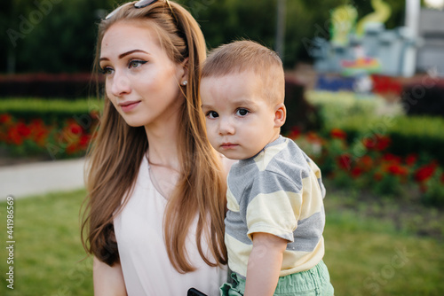 A young beautiful mother plays and hugs her little son during the sunset in the park. Happy family walk in the park.