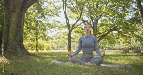 A young beautiful white girl practices yoga in the park and meditates in the lotus position among the trees in a clearing on a summer day