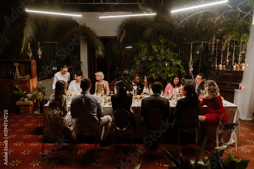 A young Black bride and groom, aged 25, chatting cheerfully while sitting among their guests at the dinner table, after the wedding ceremony, with large potted plants around them