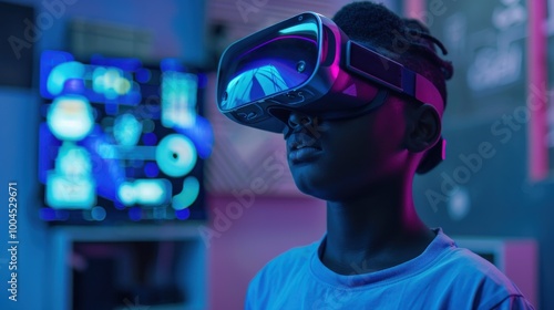 A young black man wearing a blue shirt is looking at a computer screen with a vi