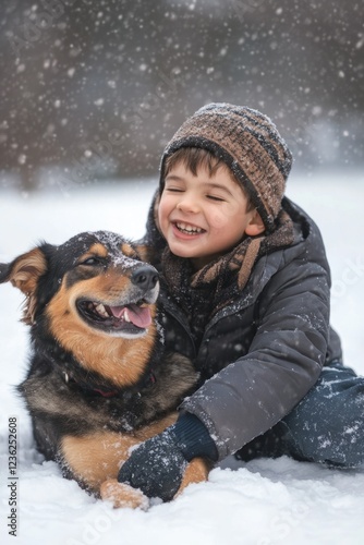 A young boy and his dog share a joyful moment in the snow, laughing and playing together.