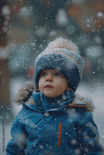 A young boy dressed in a blue jacket and hat, likely for outdoor activities such as hiking or skiing