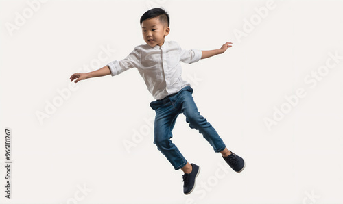 A young boy in a white shirt and blue jeans jumps in front of a white background