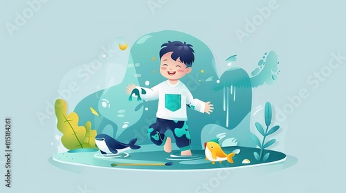 A young boy is playing in a tide pool at the beach. He is smiling and laughing, and his clothes are wet. He is surrounded by colorful fish and sea creatures.