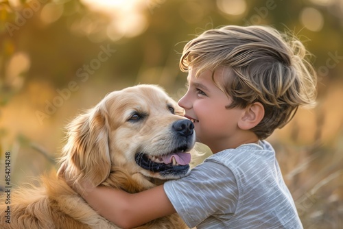 A young boy is shown embracing a golden retriever in a tender moment, face not visible