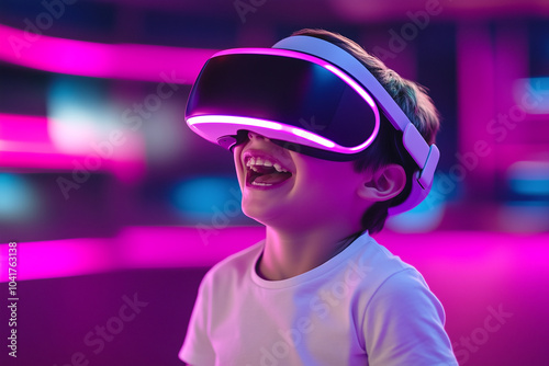 A young boy laughing while wearing a VR headset and headphones, immersed in a vibrant, colorful digital world.