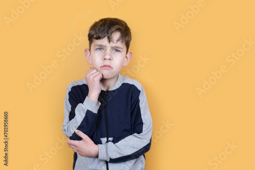 A young boy misses and longs for his parents on an orange background, his parents work abroad and boy rarely sees them and suffers from loneliness