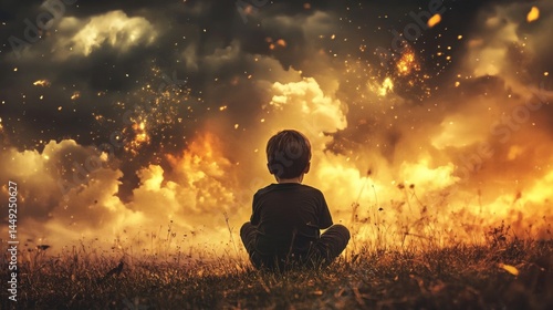 A young boy sits in a field, gazing up at a burning sky. Concept of hope, resilience, and overcoming adversity.
