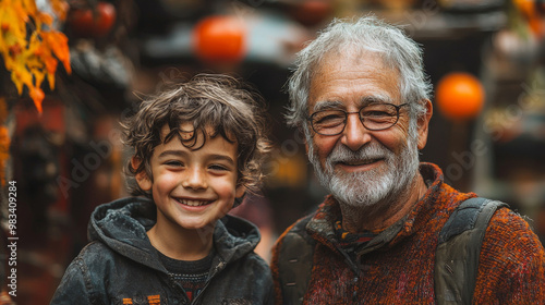 A young boy smiles alongside his grandfather.