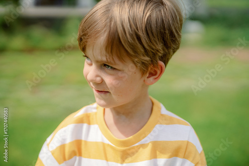A young boy stands in a lush green backyard, wearing a striped yellow and white shirt. His gaze is cheerful, capturing the joy of a sunny day spent outdoors with friends.
