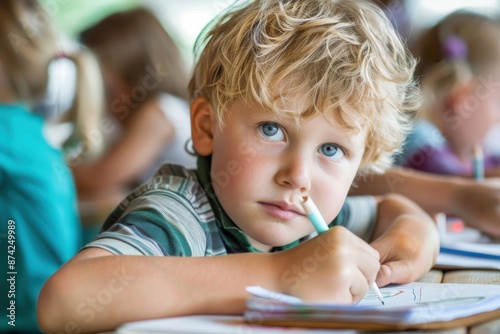 A young boy with blonde hair and blue eyes is intently focused on his work, writing in a notebook with a light blue pen.