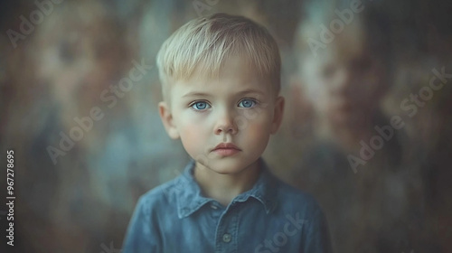 A young boy with blonde hair and blue eyes is standing in front of a wall. The boy is wearing a blue shirt and a blue button-up shirt. The wall behind him is blurry, giving the image a dreamy