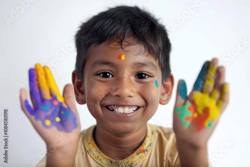 A young boy with colorful hand paintings, great for kids' activities or creative projects