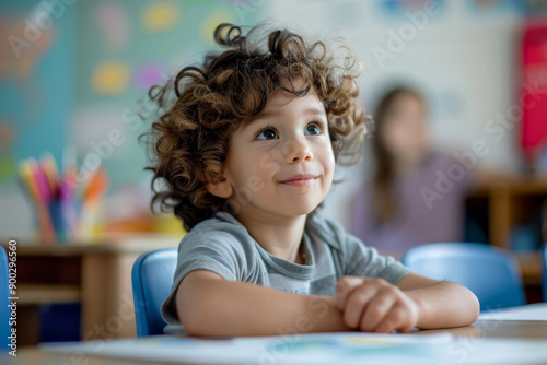 A young boy with curly hair is sitting at a desk in a classroom. Concept of curiosity and learning