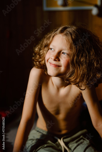 A young boy with curly hair smiles happily in a cozy room, capturing a joyful moment as he relaxes, showcasing the warmth of family life during the day.