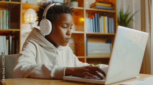 A young boy with headphones working on his laptop, surrounded by books and plants, in a brightly lit, well-organized study room.