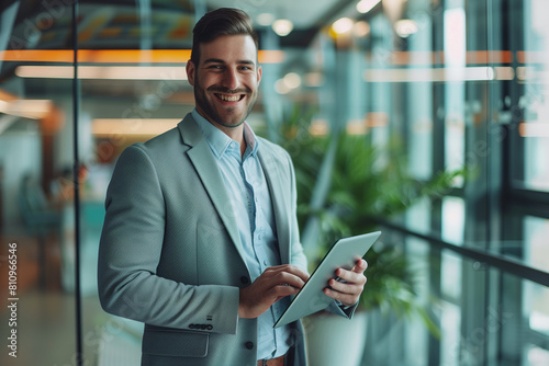 A young businessman, enchanted by the possibilities offered by digital technology, holds a tablet in his hand, full of optimism and ready for the challenges of the day.