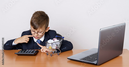 A young businessman is counting on a calculator. There is a computer and a mini shopping trolley on the table.