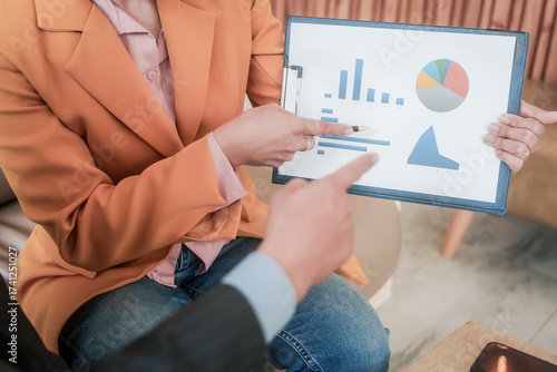 A young businessman is showing something to his colleagues on his work laptop screen. Colleagues are discussing new projects or startups and analyzing the company's performance.