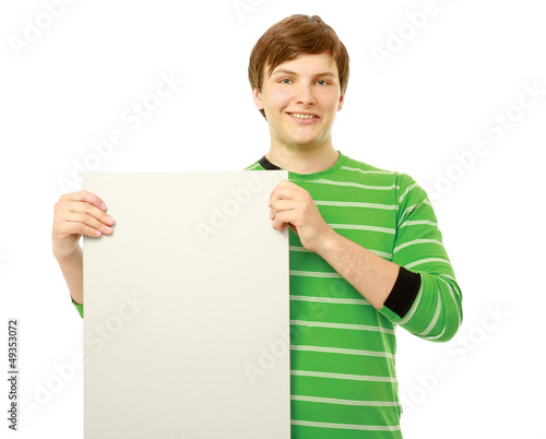 A young casual man holding a white card