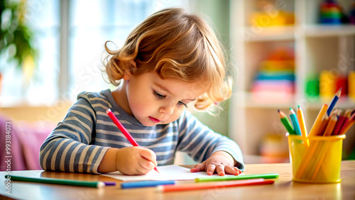 A young child drawing with crayons on a table, with a look of concentration and creativity.