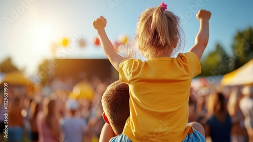 A young child sits joyfully on a man's shoulders, cheering with excitement while attending a vibrant festival event filled with warm sunlight and festive vibes.