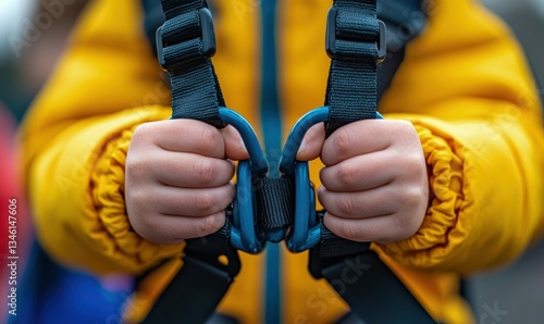 A young child tightly grips the safety harness before their climbing adventure, wearing a yellow jacket.