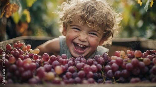 A young child with curly hair smiles joyfully while surrounded by ripe grapes in a vineyard. The scene captures the delight of harvest season, showcasing nature's bounty and innocence.