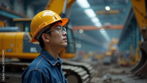 A Young Construction Worker Observes Machinery in a Large Industrial Warehouse During the Day