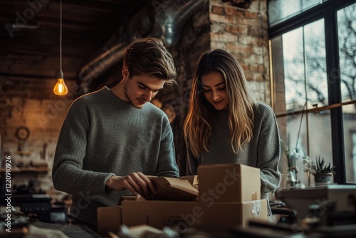 A young couple carefully unpacks and sorts items from cardboard boxes in their cozy home.