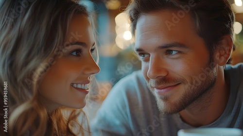 A young couple discussing their options between a fixed-rate and adjustable-rate mortgage over coffee, contemplating their long-term financial securit, close up, Financial planning theme Realistic
