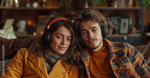 A young couple in a relaxed home setting share a moment, each wearing stylish, high-quality over-ear headphones.