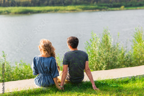 A young couple is romantic in the park on a lake. Man and woman sit in the summer sun in the green grass