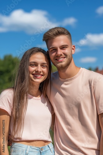A young couple is smiling and posing for a picture. The girl has long hair and the boy has a beard. They are both wearing pink shirts