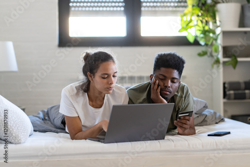 A young couple lying on their bed, shopping online with a tablet and credit card in hand, in a bright and cozy modern bedroom