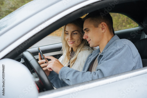 A young couple on a road trip looking at a map on their phone in a navigator.