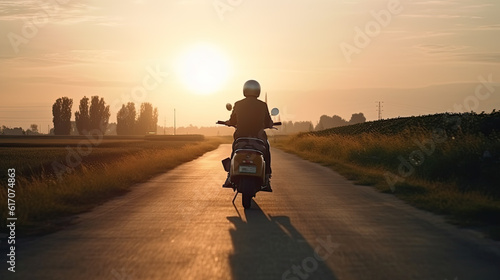 a young couple rides a scooter into the sunset. back view. Generative AI