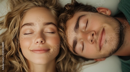 A young couple with closed eyes, smiling peacefully while lying together on a soft surface.